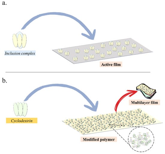 In addition to the formation of inclusion complexes as a potential tool in developing active packaging, mainly linked to the higher stability conferred to the guest molecule (bioactive component), CDs have also been studied as a component of the polymer matrix itself (Figure 3). The participation of CDs as components of polymer blends may promote a deceleration of both internal and external migration of volatile substances, whether from the packaging material itself or the packaged product, or even the external environment [16]. Thus, the incorporation of “empty” CDs can assist in the removal of a wide variety of substances considered undesirable, such as contaminants and odors, acting as absorption agents [16,90,109].