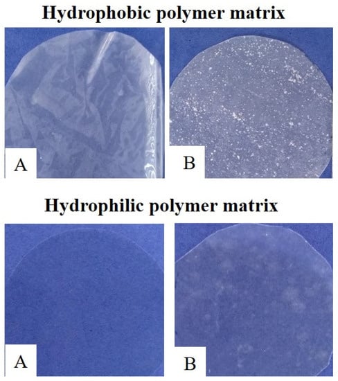 The improvement of barrier properties, mainly water vapor barrier, could be useful in particular to polymeric materials with a more hydrophilic nature. Although these materials may show a good barrier against gases, their high water permeability limits their application to certain food products. Even in environments/foods with high moisture content, their sensitivity to water considerably reduces their gas barrier properties [93]. For these materials, the structure of CDs—with their more hydrophilic exterior—allows good chemical compatibility with the polymer matrix. At the same time, its hydrophobic cavity can confer different changes in the functionality of the packaging material. To illustrate this statement, we present, in Figure 4, an example of an inclusion complex of EO and β-CD incorporated into two distinct polymeric materials: cellulose acetate (hydrophobic), and methylcellulose (hydrophilic). It is possible to observe that the IC was better dispersed in the hydrophilic matrix, unlike in the hydrophobic matrix, in which aggregates can be seen.