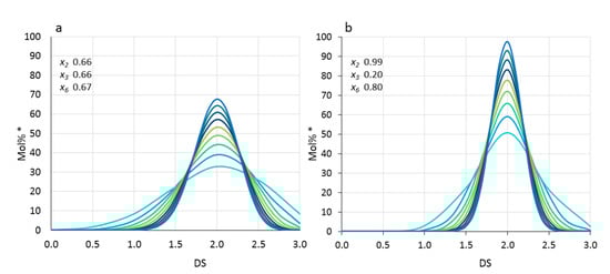 Methyl distribution profiles for domains with increasing number of AGU (DP2-10, starting with the broadest profile for DP2, ending with the narrowest for DP10) in two MCs, both with DS 1.99. (a): equal distribution on positions O-2, O-3, O-6; (b): preferred methylation at O-2 followed by O-6 and O-3. Partial DS values xi are given in the legend. * The Mol% scale does refer to 7 data points for DP2. All other profiles with increasing number of data points are normalized to DP2 for comparability.