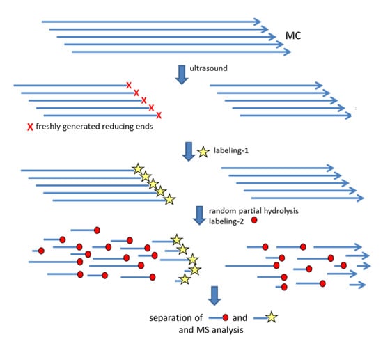 First, a MC (DS 1.96) was permethylated with MeI-d3, to achieve a chemically uniform polymer (→MDC). By this peralkylation, the originally free OH become isotopically labeled by deuteromethyl groups and can consequently be distinguished from the original methyl groups by mass spectrometric analysis. By treatment of this MDC with a sonotrode, new reducing ends should be generated: one from each MDC chain, respectively. Ultrasonic treatment ruptures macromolecules about in the middle since the forces of the collapsing cavities are strongest there [63]. This degradation mainly affects the longer molecules and finally levels off since a minimum chain length is required to act sufficiently [64,65,66]. The degraded cellulose molecules were labeled at their freshly generated reducing ends as representatives for each polymer chain with an acid resistant tag. Completeness of the reductive amination with m-amino benzoic acid (m-ABA) was proved. After partial depolymerization of polymer chains by acid-catalyzed hydrolysis, the two sets of COS obtained were separated on a cartridge. The required selectivity for the ABA-tag beside the permethylated backbone was achieved with a reversed SPE material bearing a N-benzyl-N,N-dimethyl-butane-1-ammonium group for electrostatic and π-π-interaction. Two fractions were obtained: a small one of labeled COS, according to theory approximately each presenting a different cellulose molecule, and the non-labeled ones, i.e., all others, arising from different and same chains, thus presenting both, heterogeneity of first and second order rolled into one. Subsequently, both sets of oligomers were analyzed by LC-ESI-IT-MS, independently.