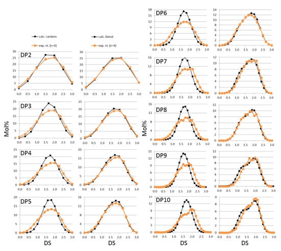 Instead of fractionating a MC into portions of narrower compositional diversity, one can choose the other way around and blend materials in order to use it as a model material for analytical studies. In order to check the capability of our MS analysis of COS, we blended two MDCs, one of low (1.29) and one of high average DSMe (1.96), at a molar ratio of 2:3, i.e., with an average DS of 1.69 and a ΔDS of 0.67. This artificial bimodal MC obviously had a pronounced heterogeneity of first order, while each of the two MCs had a close to random, only slightly heterogeneous methyl distribution. We calculated the theoretical methyl distributions for each particular DP. On one hand, we used the overall monomer constituents of the blend, on the other hand, we calculated the distributions of the two MCs independently, and then formed the weighted average, i.e., the theoretical substitution profile expected for the blend (disregarding some heterogeneity of the MCs). This is illustrated in Figure 4 (black profiles). The first ones are naturally much narrower than the latter. Those methyl distribution profiles broaden with DP, in our case develop a plateau at DP7 and a saddle point at DP8. Beyond DP8, the two individual profiles start to become visible separately (see also Figure S2, Supplementary Material). The experimentally obtained methyl profiles (orange curves) were compared with the two theoretical distribution curves (Figure 4), one assuming a single batch of MC and one referring to the blend.