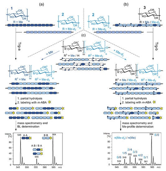 - Cuers, J.; Unterieser, I.; Burchard, W.; Adden, R.; Rinken, M.; Mischnick, P. Simultaneous determination of substituent patterns in partially acid hydrolyzed O-Me/O-Me-d3-cellulose and quantification of the obtained oligomers by HPLC-ESI-MS. Carbohydr. Res. 2012, 348, 55–63. [Google Scholar] [CrossRef] [PubMed]