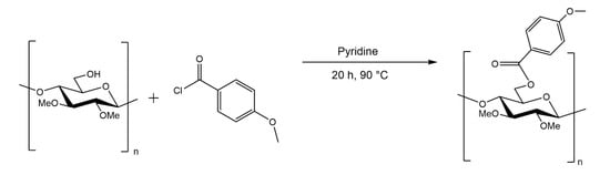- Xu, D.; Voiges, K.; Elder, T.; Mischnick, P.; Edgar, K. Regioselective Synthesis of Cellulose Ester Homopolymers. Biomacromolecules 2012, 13, 2195–2201. [Google Scholar] [CrossRef]