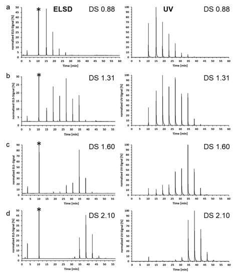 Figure 8 shows the chromatograms (ELSD) for four MC-MeOBz with DSMe 0.88, 1.31, 1.60, and 2.10. The UV-active peak at 10 min occurs in all samples and results from contamination with 4-methoxy-benzoic acid. Unfortunately, its retention time is identical to that the of per-methoxybenzoylated cellulose, but by more thorough purification, it can be removed. The peaks are generally superimposed by artifact signals of the ELSD, due to fast change of solvent composition. However, it is clearly visible that the maximum of the distribution is shifted to longer retention times with increasing DS.