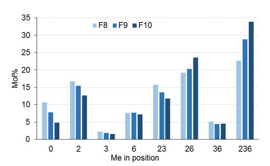 Applying our MS analysis of oligomeric domains to HPMC, enhanced resolution of the substituent distribution was achieved by using the number of HP groups as a probe [61]. By mass spectrometric separation only, it became possible to consider sub-patterns of the methyl distribution: The lower the number of HP, and especially for the fraction with n(HP) = 0, the lower was the methyl DS and the more heterogeneous the methyl distribution. This effect was better visible the smaller a considered fraction was, since the poorly activated portions of cellulose usually are present on very low amounts. To see their deviating substitution requires to avoid “dilution” of these portions by the much larger number of randomly substituted molecules [25,61].