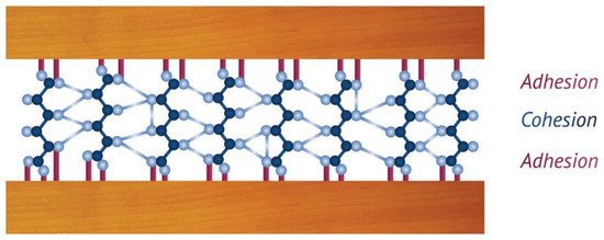Kumar and Pizzi [42] explained the mechanism of adhesion for wood by adding another type of adhesion called effective adhesion, which combines the specific and mechanical adhesion explained above. They also established that the bonding effectiveness is a combination of adhesion and cohesive strength. Cohesion is defined as the internal strength of an adhesive because of a variety of interactions within the adhesive (Figure 1). In this way, an adhesive bond would fail if either an interfacial adhesion failure occurs (if the adhesive is separated from substrate) or if there is a cohesive failure.