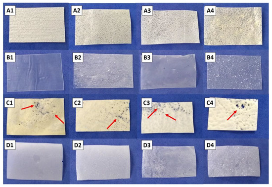 Images of the obtained blends and cellulose acetate (CA) films. Blends (line A) and their respective CA films (line B) with incorporated tributyrin and additives: control (no additive, A1,B1), βCD (A2,B2), GEO (A3,B3), and inclusion complex (A4,B4). Blends (line C) and their respective CA films (line D) with incorporated glycerol and additives: control (no additive, C1,D1), βCD (C2,D2), GEO (C3,D3), and inclusion complex (C4,D4). Red arrows indicate the presence of macro-holes and tears.