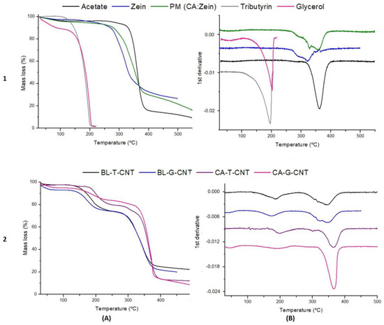 Thermogravimetric curves (A) and their respective 1st derivative (B) of: (1) pristine polymers (cellulose acetate and zein) and their physical mixture (PM), plus pristine plasticizers (tributyrin and glycerol); (2) control blends with tributyrin (BL-T-CNT) or glycerol (BL-G-CNT) and cellulose acetate films with tributyrin (CA-T-CNT) or glycerol (CA-G-CNT).