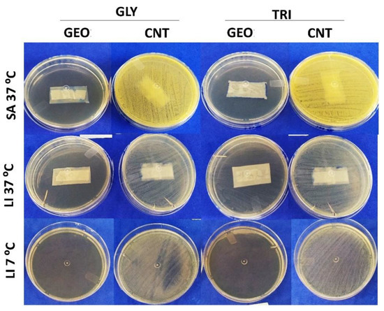 Under refrigeration (7 °C/10 day), L. innocua, a psychrotrophic bacteria, did not exhibit visual growth when incubated in the presence of films with 10% GEO incorporated, independent of the plasticizer (Figure 4). In this case, despite the ability to grow under refrigeration temperatures [54], the cold conditions contributed to the GEO antibacterial activity. GEO thermal stability at lower temperatures was not assessed in the present research; however, low temperatures were already associated with stabilizing some GEO compounds [55]. This improved activity minimized the possible entrapment effect of tributyrin, and the films were able to control the bacteria growth during the incubation period. In addition, films with IC incorporated once again underperformed compared with the films with added GEO and only partially inhibited L. innocua growth when under refrigerated conditions (results not shown). These results are in agreement with the MIC values found, since it was verified that a much higher concentration of IC was necessary to inhibit microbial growth, indicating that more IC should be added to the filmogenic dispersion in order to obtain films with a similar active property to the films with added GEO. However, this would hardly be viable.