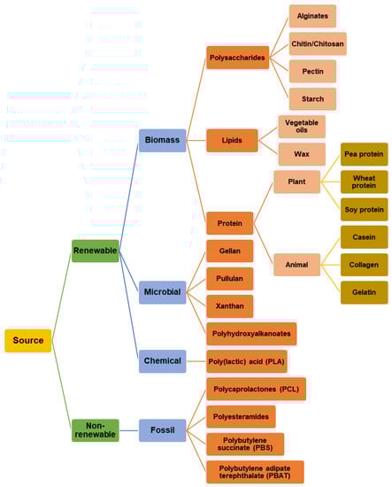 Biobased packaging contains wholly or partly materials from biological origin [,]. Materials from biological sources (e.g., plants, animal, microorganisms, seafood, woods, and agricultural residues) are naturally biodegradable and compostable. These materials when used for packaging can be degraded by the action of living organisms upon disposal and converted to CO2, CH4, H2O, inorganic compounds, or biomass, returning to nature [,,]. Once made by biological resources, such as proteins, polysaccharides and microbial polyesters, packaging materials can be named as biobased plastics. Biobased materials are obtained from renewable carbon resources, as plants or biomass, such as chitosan, starch, cellulose, hemicellulose, poly(lactic) acid or vegetable oils [,]. Besides renewable resources, biodegradable materials can be produced from petroleum-based products [,]. Different biodegradable materials and their sources are displayed in Figure 1.