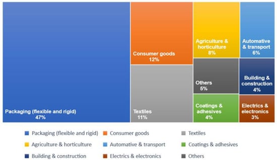 Nowadays, the global production of bioplastics, considered low, has reached a total of 2.11 million tons in 2020 and is expected to grow 15% until 2024 []. According to the report published in November 2020 by Intrado Globe Newswire [], the world bioplastic market has generated more than U$4.5 billion in 2019 and it is estimated to reach more than U$13 billion until 2027. To them, the starch-based bioplastics market should totalize U$561 million until 2023, with an annual growth rate (CAGR) of more than 3.5%. The major contribution to the bioplastic market was from the Asia-Pacific region. Europe should have the highest CAGR, more than 16%, until 2027 []. The distribution by sector of the bioplastics global production market in 2020 [] is presented in Figure 2. Thus, the plastics and packaging markets are witnessing a significant increase on demand for materials from renewable resources.
