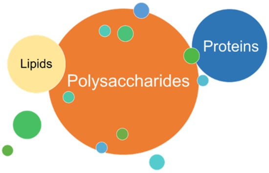 A wide range of natural polymers from renewable sources has been used in the development of biobased food packaging. The main natural sources for this purpose are derived from polysaccharides, proteins, lipids, or blends of these macromolecules [,] (Figure 3). The utilization of these natural materials is partly linked to its biodegradability and renewability. However, some other advantages are expected when used for food packaging, e.g., as these materials can act as carriers of functional substances adding well-being benefits, incorporating flavorings and colorings aspects, enhancing organoleptic characteristics, improving mechanical and barrier resistance, and others [].