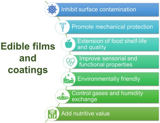 Both films and coatings should be composed only by food-grade components, GRAS (Generally Recognized as Safe), including any additives, such as plasticizers []. As any other packaging, these materials must protect the food integrity and maintain its quality [,,]. In Figure 4 is presented the main purposes of edible food packaging. Although, it is not expected that the edible films could replace completely all conventional packaging, they can be used to significantly reduce the use of petroleum-based plastics, decrease food losses, and reduce the environment pollution over a long-term.