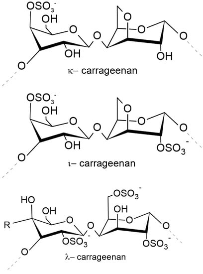 Carrageenans are sulfated water-soluble polymers consisting of of 1,3-linked-β-D-galactopyranose and 1,4-linked-α-D-galactopyranose alternating units []. Industrially, the most employed types are κ-(kappa), ι-(iota) and λ-(lambda) carrageenans, being classified according to their molecular structures, which include the sulfation arrangements as well as the existence or absence of 3,6-anhydro-α-galactopyranose on the 1,4-linked α-galactopyranose unit []. Figure 6 shows the main types of carrageenans used for industrial purposes.