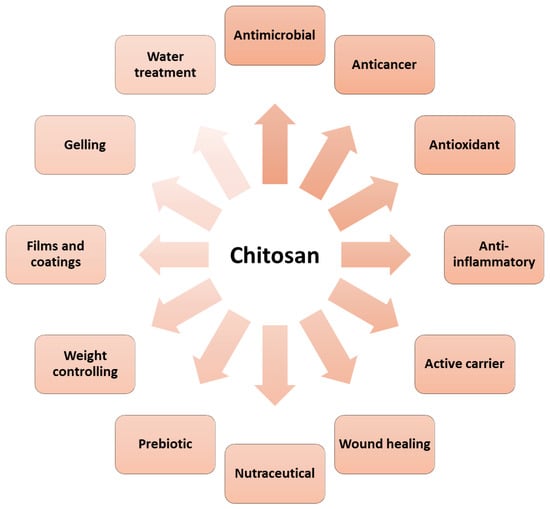 Chitosan is a polysaccharide derived from chitin, which is found in crustaceans shells, in the exoskeleton of insects or produced by microorganisms [,]. After cellulose, chitin is the second most abundant polysaccharide in the world, exhibiting a global turnover around 1011 tons per year []. The earliest works with chitin and chitosan date from the 1850s with Charles Rouget and later in 1890s with Felix Hoppe-Seyler []. Since then, chitosan has been used to a wide range of purposes, mainly because of its renewable sources, relevant biological properties (e.g., as antioxidant, antimicrobial, and anticancer activities), as well as to its biodegradability, biocompatibility and nontoxicity [] (Figure 7).