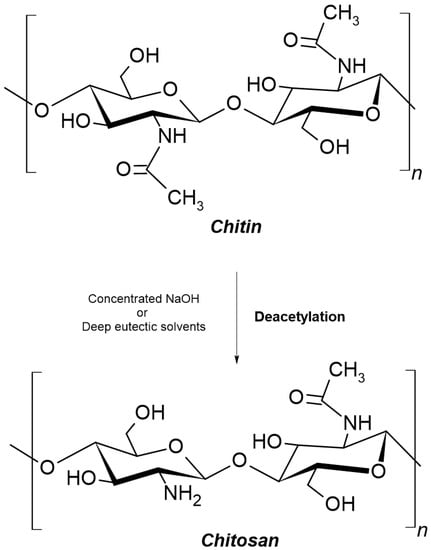 Chitin is composed by (1,4)-β-2-acetamido-2-deoxy-D-glucopyranose units and low amounts of (1,4)-β-2-amino-2-deoxy-D-glucopyranose units, whereas chitosan is composed of N-acetyl-D-glucosamine (A-units) and deacetylated D-glucosamine (D-units) units []. The main difference is that chitosan is deacetylated (Figure 8), which makes it soluble in mild acidic solutions, whereas chitin is insoluble in many organic and inorganic solvents []. The presence of hydroxyl and amine groups in chitosan chains allows the occurrence of chemical changes under pronation, which can influence significantly its biological, mechanical, and physical-chemical properties [,]. The NH2 groups located at C-2 of rings on the D-glucosamine repeating units promote a polycationic behavior of the chitosan chains []. This polycationic characteristic allows the formation of electrostatic interactions between chitosan and other polyanionic biopolymers, such as sodium alginate, and some amphiphilic proteins. The formation of such complexes is used to encapsulate bioactive substances and to form micro- or nanoparticles by complex coacervation [,,]. The protonated amino groups are responsible for chitosan interaction with negative cell membranes of microorganisms, altering its permeability and metabolism, chelate trace metals and microorganism’s spores, thus leading to cell death and inhibiting microbial growth [].