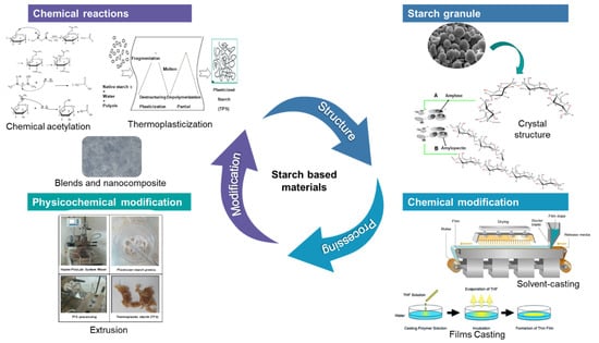 Starch is not a thermoplastic material, however in the presence of plasticizers (water and polyols), heat and under shear stresses or in their absence it behaves as a thermoplastic. Plasticization of the starch granule by extrusion leads to structural disruption and diffusion of the plasticizer. Starch is incorporated in the form of granules or in gelatinized form in film formulations manufactured by thermoplastic material transformation processes [9,10]. These films have the disadvantage of moisture sensitivity; to reduce these disadvantages, starch has been blended with other synthetic or biodegradable polymers such as PLA, or chemically modified [11,12]. Different starch-based materials are available on the market under the brand names Mater-Bi®, Bioplast and Biopolar. The properties of starch-based materials depend, among other factors, on the botanical source, crop conditions and genetic variety where the starch is extracted from. The aim of this review paper is to review the evolution in the preparation, modification, and processing of starch-based materials for food packaging applications. Figure 1 shows a schematic of the structure, modifications and processing techniques studied in the evolution of starch-based materials.