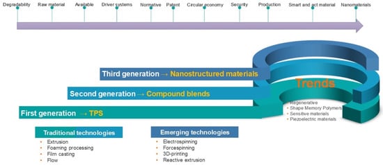 Starch is an attractive raw material for non-food industrial applications as it is widely available, cheap, biodegradable, and uniquely granular. However, the swollen granules cannot retain their swollen structure and collapse instantaneously. Starch materials have limited industrial applications due to their high hygroscopicity, poor mechanical properties and syneresis [59]. Hence, at least three generations of starch-based materials can be distinguished (Figure 2): Traditional, where the development of thermoplastic starches was achieved; Transitional, where physical and chemical modifications, blends with other polymers and industrial scale processing were possible; and, Nanostructured. Several strategies have been reported to improve the performance of starch-based materials in humid environments. For example, starch can be blended with a hydrophobic polymer, such as poly(lactic acid) and polyhydroxybutyrate to increase its hydrophobicity [60,61,62]. However, these blends have poor mechanical properties and high starch contents [13]. Incorporating natural fibers into starch-based materials also reduces their water uptake, however these materials also require a high fiber content to decrease their hydrophilicity [63,64]. Another way to improve starch based materials’ properties through chemical or physical modification. This can be achieved by reducing its hydrophilicity and tendency to dissolve in water via esterification of OH groups of α-D-glucan with methylene groups [65,66]. Currently we are in the most advanced generation, where new processing techniques and modifications and the manipulation of matter at the nanometer scale have all been achieved and, as such, have enabled the creation of high performance materials.