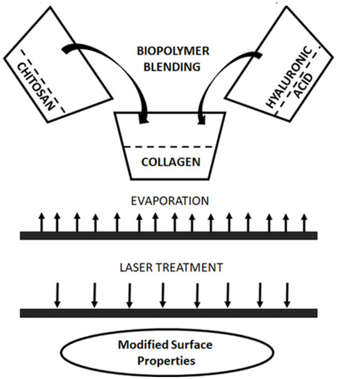 Preparation of biopolymer blend based on collagen, chitosan, and hyaluronic acid and laser treatment of biopolymer film.