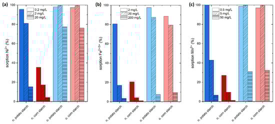 Unlike Ni2+, Fe2+/3+, and Mn2+ adsorption, sulfate ion adsorption on o. and n. potato starches is negligible. The values fluctuate between 0% and 5%. Zeta potential and charge density measurements showed the negative charge of all starch samples between pH 4 and 7 [16]. All adsorption studies were carried out at this pH range which explains the repulsion of negatively charged sulfate to the anionic starch surface (see Figures S1–S3). However, the adsorption of sulfate in low amounts is possibly owing to a kind of cooperative mechanism with sulfate and certain cations [16].