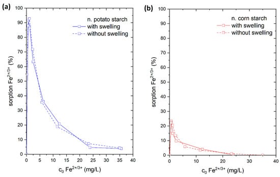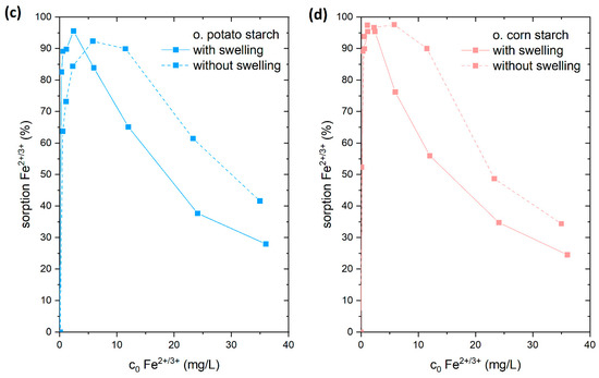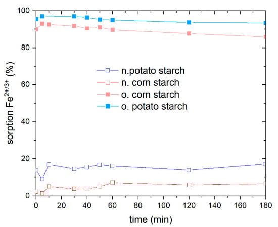 The adsorption efficiency of Fe2+/3+ from aqueous media featured high adsorption values at different concentration ranges 10-, 100-, and 1000-fold values of the drinking water concentration limit. As expected, the n. potato starch has higher adsorption rates than n. corn starches because of the high negative charge caused by the presence of more OH groups on the surface of the n. potato starch than the n. corn starch (see Figure 1). The negatively charged starch (anionic surface) and cationic metal ions interact significantly. The adsorption process is facilitated by this interaction. At a concentration of 20 mg/L, which corresponds to the 10-fold of drinking water limit, the n. potato starch achieved 80% removal, while at the 100-fold concentration the adsorption lies at 16% owing to the high initial concentration. The adsorption of both o. starches is significantly higher than the removal by n. starches. At a 10-fold limit value, the adsorption corresponds to 97% and 88% for o. corn starch and o. potato starch, respectively. At the 100-fold level, 87% and 79% were adsorbed using o. corn starch and o. potato starch, respectively. At 200 mg/L Fe2+/3+, which corresponds to the 1000-fold of drinking water value, the metal ion removal lies at 7.5% and 9.5% for o. corn starch and o. potato starch, respectively. The pH values of the sorption of Fe2+/3+ are presented in Figure S2.