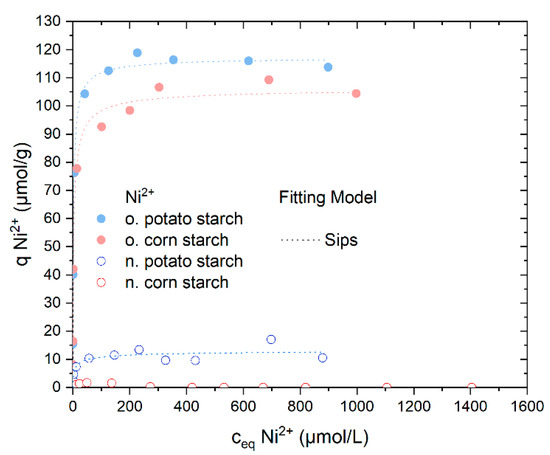 The o. starch samples provide the best adsorption rate of Ni2+, as shown in the screening experiments in Figure 3. The o. potato starch and the o. corn starch almost removed 100% Ni2+ in a concentration range from 2.8 to 260 µmol/g (see Figure S5). Thus, the results agree with the first investigations in Section 4.2. The removal of the nickel ions with the n. potato starch was successful although lower than the adsorption of the o. starches; it reached 95% at 8.7 µmol/L. The uptake of Ni2+ by n. corn starch is negligible (see Figure S5). In Figure 5, the o. starches show much higher adsorption capacities of almost 120 µmol/g and 100 µmol/g Ni2+ ions for o. potato and o. corn starch, respectively. In comparison, n. potato starch has a lower value of adsorption capacity above 10 µmol/g. No adsorption of sulfate was observed (Figure S6).