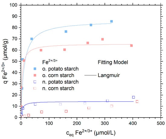 Only the Langmuir and the Dubinin–Radushkevich model rendered a meaningful fit for the tested Fe2+/3+ isotherm. The fitting data are shown in Table 3 and the graphical comparison of the different fitting models is presented in Figure S11. As the Langmuir model showed the best fit for the different starch samples, its graph is presented in Figure 6. The maximal adsorption capacities of the Langmuir isotherm model were 14.3 µmol/g, 86.3 µmol/g, and 65.7 µmol/g on n. potato, o. potato, and o. corn starch, respectively. This is in very good agreement with the maximum experimental adsorption capacities. The n. corn starch does not provide a fit for any of the three chosen adsorption models due to the low adsorbed amount of Fe2+/3+. The pH values of the sorption of Fe2+ are presented in Figure S12.