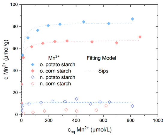 The adsorption of o. potato starch and o. corn starch reached a plateau at almost 65 mol/g and 80 mol/g, respectively. The presence of carboxyl and carbonyl groups accounts for the increased metal ions adsorption compared to n. potato starch and n. corn starch. N. potato starch reached a plateau with values of around qeq = 10 µmol/g. The adsorption of SO42− was not observed (see Figure S14). The pH values of the sorption of Mn2+ are presented in Figure S15.