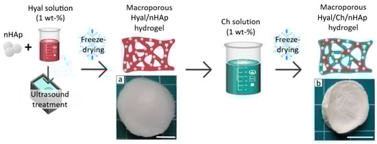 A scheme for fabrication of composite hyaluronic acid/chitosan hydrogels loaded with hydroxyapatite nanoparticles (Hyal/Ch/nHAp). Photographs of the macroporous hydrogel samples prepared from the Hyal solution with hydroxyapatite nanoparticles (10 wt. %) before (a) and after (b) immersion in the chitosan solution. Scale bar is 10 mm.