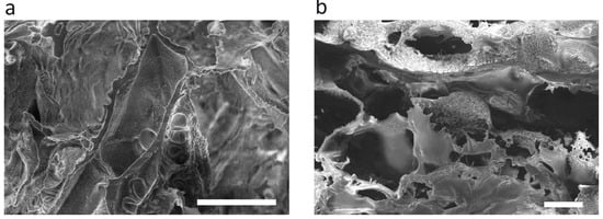 The morphology of the vertically and horizontally cross-sectioned hydrogel samples was examined using Zeiss EVO 40 scanning electron microscopy (Oberkochen, Germany) equipped with an X-Flash 1106 silicon drift detector. To ensure a charge drain, a sample surface was coated with a thin conducting Al film by sputtering. The microscope chamber was evacuated to a working vacuum of 6 × 10−4 Pa, and examinations were performed with a maximum accelerating voltage of 10–15 kV, a minimum probe current of 15–50 pA, and a minimal working distance of 5–15 mm.