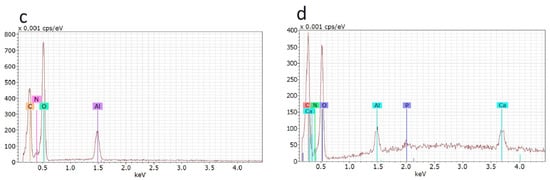 An open interconnected macroporous structure is needed to provide large specific surface for cell attachment and growth, as well as for nutrients, oxygen supply and effective mass and gas exchange [30,31]. The morphology of the dried hydrogel samples was evaluated using SEM (Figure 2a,b). The secondary and partially undeveloped pores within the primary wall structure can be seen. This was caused by an additional freeze-dry cycle after the complexation with chitosan. The hydroxyapatite nanoparticles obviously located within pore walls could not be clearly seen in the SEM images. Nevertheless, the Ca and P atoms related to hydroxyapatite were revealed by energy-dispersive X-ray spectroscopy (EDX) of a wall spot in the Hyal/Ch/nHAp-10 sample in contrast to the Hyal/Ch sample (Figure 2c,d).