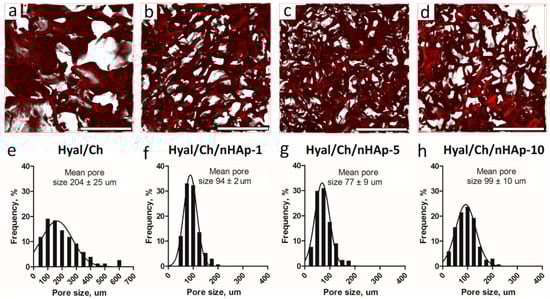 CLSM images (a–d) and the pore size distributions (e–h) in the swollen macroporous hyaluronic acid/chitosan hydrogel samples. Hyal/Ch sample was without hydroxyapatite nanoparticles (a,e); Hyal/Ch/nHAp-1 (b,f), Hyal/Ch/nHAp-5 (c,g) and Hyal/Ch/nHAp-10 (d,h) samples were loaded with 1, 5 and 10 wt. % of nanoparticles, respectively. Scale bar is 500 µm.