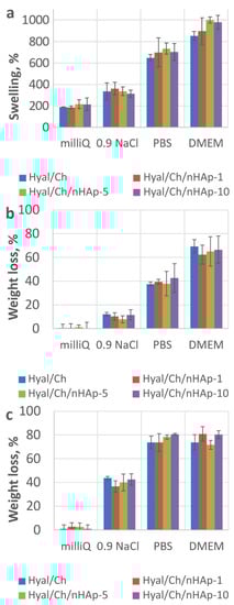 To estimate the stability of the hydrogel samples at physiological conditions, swelling ratio and weight loss in various aqueous media were studied. As seen from Figure 4, both parameters were highly affected by medium properties. Thus, the ionic strength of the solution where the samples were incubated played a key role in the sample behavior. The presence of ions in the 0.9% NaCl solution, PBS (pH 7.4) and the culture medium led to a weakening of ion bonds within the polyelectrolyte Hyal/chitosan complexes. Similar trends were observed for all hydrogel samples. An increase of the nHAp content in the hydrogels resulted in swelling enhancement, which was markedly expressed the in case of the culture medium use (Figure 4a). All the hydrogel samples were stable in milli-Q and did not resorb after 4 weeks of incubation (Figure 4c). In the physiological solution (pH 7.2), all the hydrogel samples were relatively stable for at least 4 weeks of incubation (weight loss was less than 45 wt. %). Incubation in DMEM and PBS (pH 7.4) resulted in a significant degradation of the samples (Figure 4b). After 7 days of incubation in PBS (pH 7.4) and DMEM the weight loss values were 40% and 70%, respectively. After 4 weeks incubation in PBS (pH 7.4) and DMEM, the weight loss reached a plateau of about 80%. An increase in the nHAp amount within the hydrogels led to degradation decrease. Nevertheless, further increase in the nHAp content (up to 10 wt. %) resulted in the swelling decrease again, while the weight loss again increased. However, it should be noted that differences in swelling and weight loss for the samples with different nHAp contents were not significant. The results on weight loss analysis in PBS (pH 7.4) was in a good agreement with those reported earlier [13]. Coimbra et al. reported that weight loss of Hyal/Ch PEC hydrogel reached a plateau at about 35% after 3 days of incubation. However, differences in the behavior of the hydrogel at further incubation was observed, which could be explained by the difference in the experiment design, since in the work of Coimbra et al. the medium was not replaced, while in our study the medium was refreshed once a week.