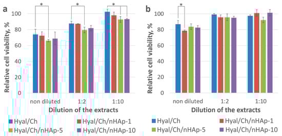 Viability of the L929 (a) and HOS (b) cells after incubation with the non-diluted extract and diluted extracts (1:2 and 1:10) for 24 h. Hyal/Ch sample was without hydroxyapatite nanoparticles; Hyal/Ch/nHAp-1, Hyal/Ch/nHAp-5 and Hyal/Ch/nHAp-10 samples were loaded with 1, 5 and 10 wt. % of hydroxyapatite nanoparticles, respectively. Results are presented as a percentage of viable cells compared to that of the cell monolayer culture (100%). Three parallel replicates were carried out for each sample. (*) Indicates statistical significance compared to the Hyal/Ch sample (p < 0.05).