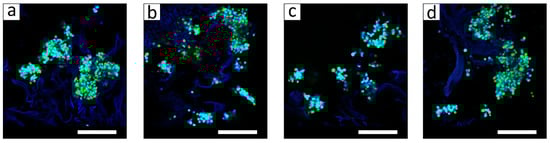 To qualitatively evaluate cell viability and morphology within the hydrogels, L929 fibroblasts were seeded in the hydrogels, and after cultivation for 1 week, they were stained with the Calcein AM vital dye and observed by CLSM. The hydrogel structure was visualized by non-specific adsorption of fluorescent DNA dye Hoechst (in blue). As seen in Figure 6, alive cells (in green) were found in all hydrogel samples. The cells formed aggregates, which were mainly attached to hydrogel walls.