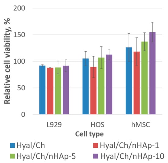 Since the hydrogels tended to degrade in the culture medium with rather high ionic strength, it was of great importance to evaluate an effect of hydrogel extracts on cell viability. A relationship between cell viability and the nHAp content was demonstrated in extract tests using L929 and HOS cell lines. As seen from Figure 5, the entrapment of nHAp into the hydrogels resulted in a slight decrease in the cell viability compared to that observed from the Hyal/Ch sample. However, the increase of the hydroxyapatite nanoparticles content entrapped in the hydrogels up to 10 wt. % resulted in a slight increase in the cell viability, which could be explained by the difference in sample stabilities in the culture medium. The difference in the cell viability values was more evident in case of the non-diluted extracts than diluted ones (1:2 and 1:10 diluted extracts). A similar tendency was observed for both cell lines. However, in the case of the L929 fibroblasts, the effect was found to be more pronounced. The obtained cytotoxic effect could be attributed to an acidic environment resulted from a partial polyelectrolyte complex destruction.