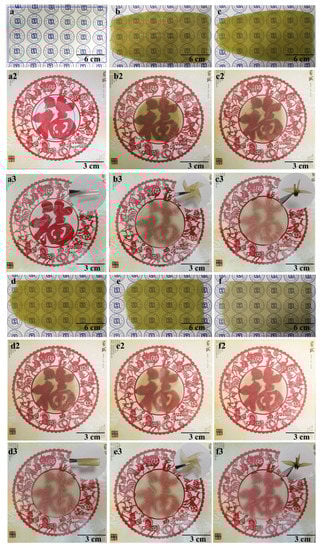 Optical photographs of patterns covered with composite hydrogels ((a), WPs-gel; (b), Gel-WPT10; (c), Gel-WPT20; (d), Gel-WPT30; (e), Gel-WPT40; (f), Gel-WPT50), films without distance and films with 10 mm distance ((a2,a3), WPs-film; (b2,b3), WPT10; (c2,c3), WPT20; (d2,d3), WPT30; (e2,e3), WPT40; and (f2,f3), WPT50).