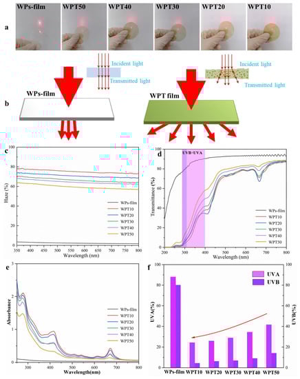 (a) The light scattering effect of the regenerated films; (b) the schematic comparison between the WPs-film and the green-tea-based composite film; (c) haze; (d) the transmittance; (e) absorbance; and (f) UVA and UVB of the regenerated films.