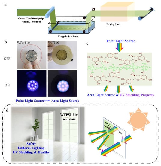 (a) A scheme of continuous production line of the green-tea-based all-biomass light-management films. (b) Application of the WPs-film and green-tea-based all-biomass composite films on a LED display device. (c) The UV-shielding mechanism of the green-tea-based all-biomass composite films. (d) The schematic scene of the green-tea-based all-biomass composite films attached to the glass door for the energy-saving buildings.