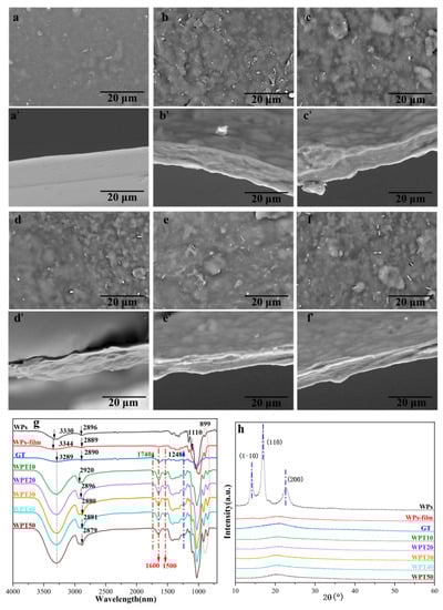 SEM micrographs of the regenerated films: (a–f) the surface and (a’–f’) the cross section of WPs-film, WPT10, WPT20, WPT30, WPT40 and WPT50; (g) FTIR; and (h) XRD profiles of WPs, WPs-film, GT, WPT10, WPT20, WPT30, WPT40 and WPT50.