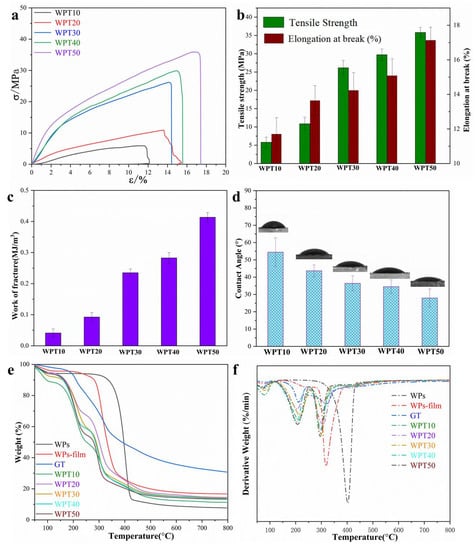 (a) Stress-strain profiles; (b) tensile strength and elongation at break; (c) work of fracture; (d) water contact angle of WPT10, WPT20, WPT30, WPT40 and WPT50; (e) TG; and (f) DTG of WPs, GT, WPs-film, WPT10, WPT20, WPT30, WPT40 and WPT50.