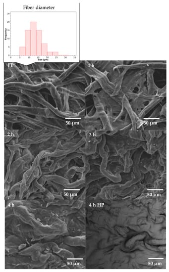 In Figure 1 SEM micrographs of filter paper and ACCs are shown. In the case of the original filter paper, randomly arranged microfibers with an average diameter value of 13.3 ± 4.2 µm are shown (the corresponding histogram is also included in Figure 1). As dissolution time increased, the progressive coverage of the voids of FP structure was observed. Indeed, in the micrographs corresponding to the samples of 4 h of treatment, the original pores are no longer distinguishable.
