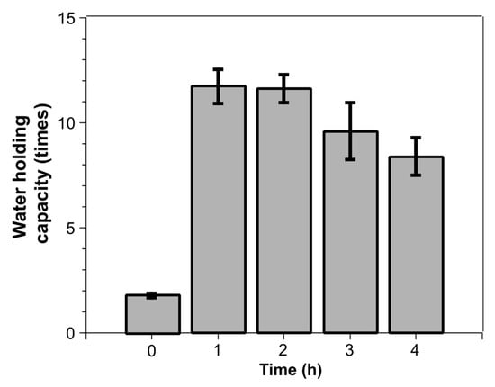 The water holding capacity (WHC) of FP increased drastically upon treatment with the NaOH/urea system, which may be attributed to the entry of the solvent and the subsequent opening of the paper structure. As shown in Figure 2, all samples studied had a WHC higher than that of the original filter paper (up to seven times). The maximum WHC value was reached after 1 h of treatment, whereas longer periods resulted in a progressive reduction in the sample WHC. Longer dissolution times promote larger amounts of dissolved and then regenerated cellulose, which may lead to a decrease in WHC due to the promotion of cellulose–cellulose interactions. Massive regeneration has been claimed to lead to an expulsion of the water trapped between chains and the reduction of total size [], due to the removal of the Na+ and the decrease in the osmotic pressure inside the hydrogel [].