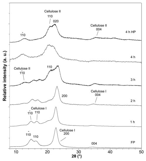 XRD diffractograms of filter paper (FP) and ACC samples treated with 7 wt% NaOH/12 wt% urea for 1, 2, 3, 4 h and 4 h HP (hot pressed). Miller indices are according to French [].