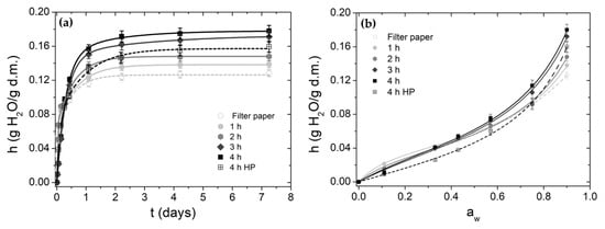 Regarding the isotherms of the 4 h HP sample, as compared with those of the other samples, some differences in their shape were observed, particularly for aw < 0.6 which corresponds to the hydration water directly bound to the polymeric matrix forming the monolayer. The convexity or concavity of isotherms in that region is linked to the value of parameter c of Equation (7), which is related to the force of the water binding to the monolayer. As parameter c increases, the isotherms at aw < 0.6 become more concave. Particularly, the isotherm of the 4 h HP sample presented the smallest value of c and exhibited more convexity in that region. Hot temperature and pressure drying produces an exhaustive dehydration that results in a greater number of direct interactions between the polar (hydrophilic) groups of the cellulose. Some of these interacting groups then become unavailable for hydration, reducing the number of primary hydration sites.