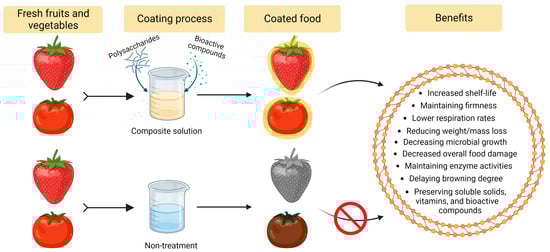 Beneficial effects of the application of polysaccharides-based edible coating on fruits and vegetables. Created with Biorender.com (accessed on 30 January 2023).