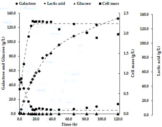 - Mwiti, G.; Yeo, I.-S.; Jeong, K.-H.; Choi, H.-S.; Kim, J. Activation of Galactose Utilization by the Addition of Glucose for the Fermentation of Agar Hydrolysate Using Lactobacillus brevis ATCC 14869. Biotechnol. Lett. 2022, 44, 823–830. [Google Scholar] [CrossRef]