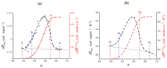 As for the other thermodynamic parameters of the transition, it was decided to numerically revisit in the present paper only the enthalpic parameters related to the dissociation of pectate and revealing the transition, given the peculiar experimental results of the ITμC micro-calorimetric data. For the case of pectate in 0.05 M NaClO4, the values of the enthalpy change upon dissociation, , (normalized—as usual—per mole of dissociating group, i.e., per equivalent) are reported in Figure 2a. The corresponding entropy of dissociation, , are reported in Figure 2b. For a detailed analysis of the data—from (pKa)app (α) in Figure 1b as: = 2.303·R·T·(pKa)app (α)—and of the derived curves of —trivially as —the reader is referred to the original paper [29]. As has already been highlighted, the two “bumps” in the and curves perfectly encompass the transition range. However, inspection of Figure 2 reveals that the excess areas of the and curves, conventionally attributed to the transition, actually extend beyond both the blue and the red limits of the conformational change (δ αtr). The range of α between the values of start (αi) and end (αf) of the calorimetric “bump”, δ αconf, is larger than that of the previously defined conformational transition: δ αconf > δ αtr. The values of αi and αf have been indicated (as purple vertical segments) in Figure 2: αi = 0.17 and αf = 0.87, with δαtr = 0.70.