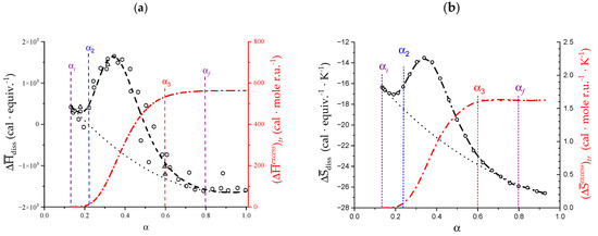 (a) Dependence on α of the molar enthalpy change in dissociation, , of pectic acid in salt-free aqueous solution (black symbols), and of the (integral) curve of (red symbols, scale on the right); (b) Dependence on α of the molar entropy change in dissociation, , of pectic acid in salt-free aqueous solution (black symbols), and of the (integral) curve of (red symbols, scale on the right).