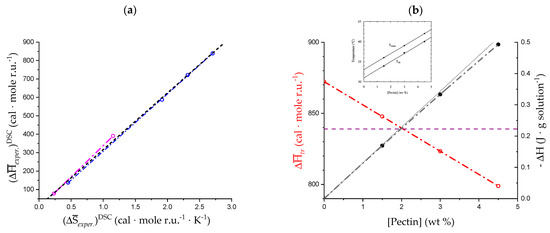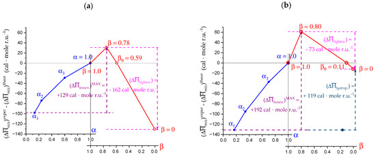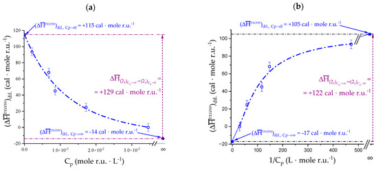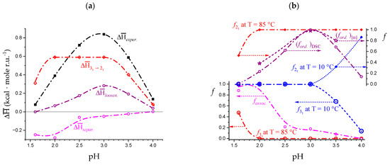 The experimental data of the enthalpy of of Figure 3 implies—among others—the separate determination of the enthalpy of dilution of the polymer vs. solvent (water). Besides this necessary aspect, the measurements of the heat of the dilution of polymers are interesting per se [65]. Figure 4a shows the remarkable similarity of the two curves represented: the red dash-dotted curve through the red crossed-circles is the curve of the enthalpy of dilution of galacturonan in water upon halving the initial polymer concentration; the black dash-dotted curve is the curve from Figure 3a. The red dashed curve at the bottom represents the calculated polyelectrolyte contribution to dissociation as a function of α [29]. A comparison with the exothermic values foreseen by theory leads to a very clear interpretation. Not only is the excess enthalpy change in dilution always endothermic, but its almost perfect overlap with the dissociation enthalpy curve demonstrates that the two trends reflect the same underlying process, namely the charge-induced changes of conformation. Moreover, one should underline that—even besides the “bump” corresponding to the 31 → 21 transition—the experimental curve keeps showing an endothermic excess with respect to the theoretical one up to α = 1.0, which must be traced back to the persistence of the loosening process.